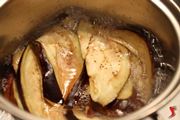 Il giorno dopo o trascorse almeno 8-10 ore, mettete a bollire l'aceto nel quale farete sbollentare le melanzane. Quando l'aceto bolle immergete le melanzane per 2-3 minuti e scottatele. Se la pentola è piccola sbollentate le melanzane poche per volta, dopo di che scolatele e fatele asciugare su dei canovacci o al sole su un asse di legno.