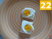 Iniziare a preparare le tartine con un qualsiasi ingrediente (20), qui partiremo con lo spalmare la maionese sul pane bianco (21) e aggiungendo poi l’uovo sodo sulla superficie (22).