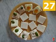 Ora che tutti gli ingredienti sono stati preparati, si può iniziare a disporre i pezzi di pane bianco tagliati a quadratini su di un vassoio capiente (18). Circondare il piatto con tutti gli ingredienti utili per la preparazione delle tartine (19).