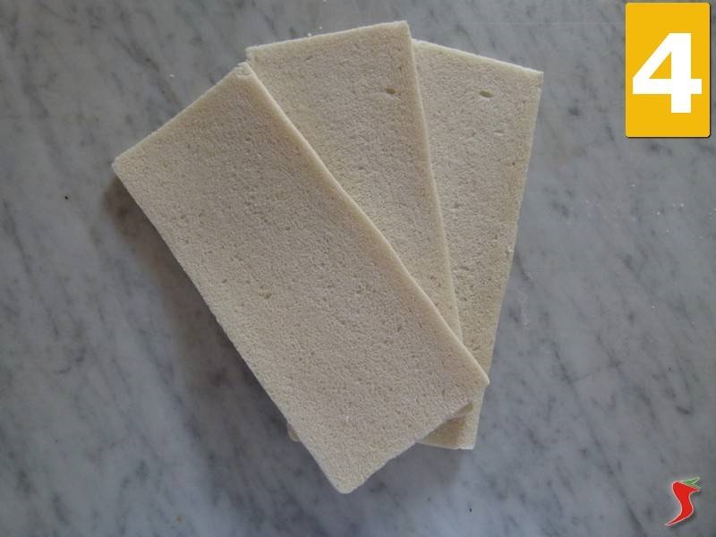 Per poter realizzare le tartine il pane più indicato è quello bianco. Qui ne utilizzeremo solo tre fette (4), le quali verranno divise in più parti (5), fino a formare dei piccoli quadratini (6) sui quali posizionare una piccola parte del condimento.