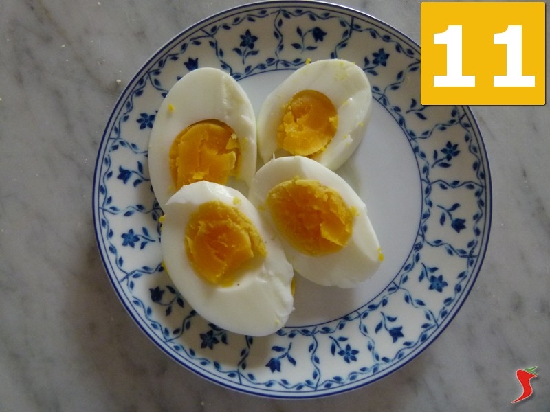 Dopo aver preparato le uova e dopo averle sgusciate, si può iniziare a tagliarle in più parti (10), fino a formare dei piccoli spicchi da riporre sulla superficie delle tartine (11).