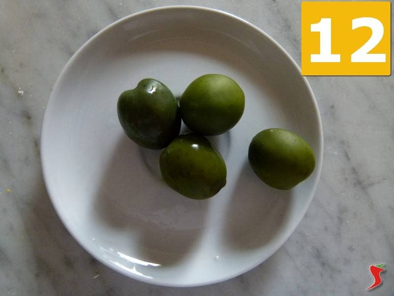 Ora si può procedere con le olive verdi (12). Quindi, lavarle sotto dell’acqua fresca e, in seguito, iniziare a snocciolarle (13), tagliandole in piccole parti che andranno a decorare le tartine (14).