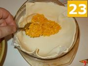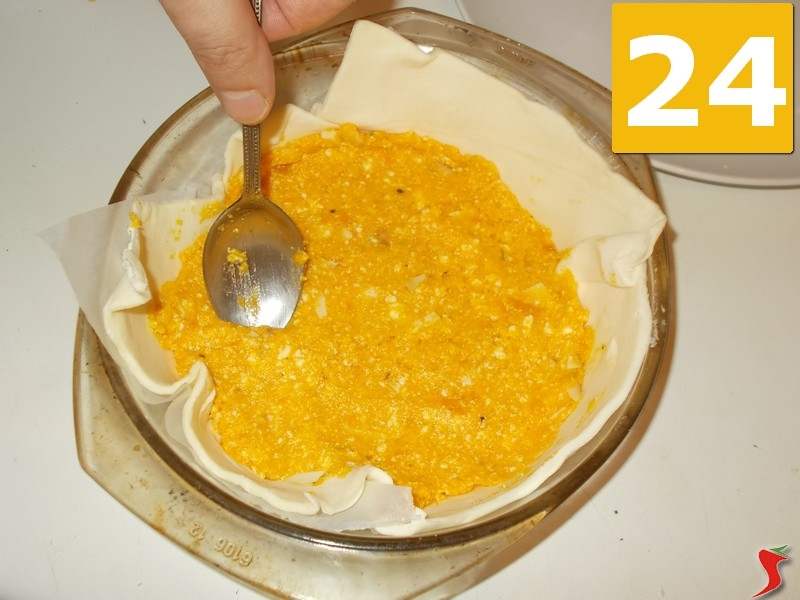 Ora con il cucchiaio iniziate a riempire (22) la pasta sfoglia di purea fino a riempirla tutta (23). Quindi sempre con il cucchiaio pareggiatene la superficie (24) in modo da ottenerne una liscia.