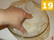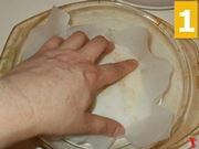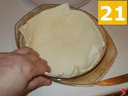 Ora ponete un foglio di carta da forno sul fondo di una pirofila (19) e quindi stendeteci dentro il rotolo di pasta sfoglia (20) in modo che aderisca perfettamente su tutte le pareti tagliandolo a misura (21).