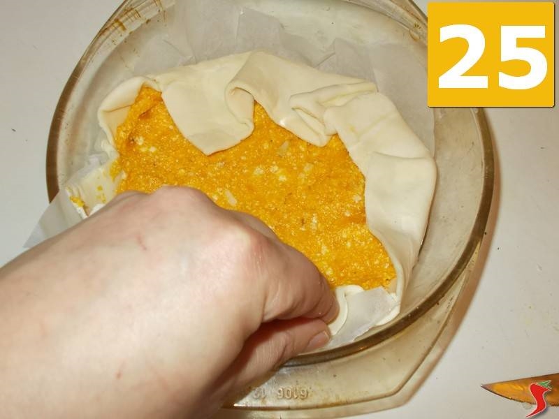 Come ultima operazione ripiegate i bordi della torta verso l'interno (25) e quindi infornatela (26) a 180°C per circa 30 minuti. Una volta cotta sfornatela (27) e quindi servite in tavola ancora calda.