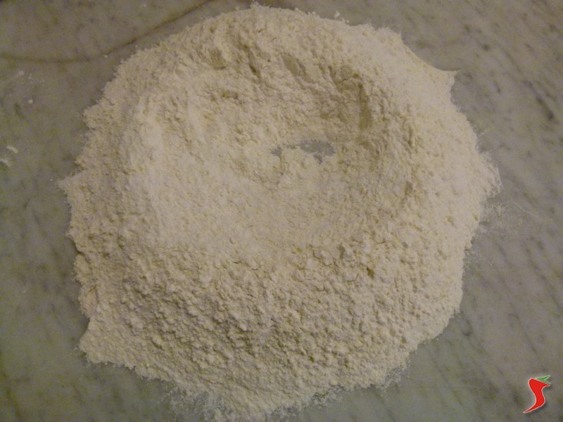 Prendere il chilo di farina e versarlo su di una superficie conferendole la classica forma di fontanella. Disporre attorno ad essa tutti gli ingredienti necessari da riporre al suo interno.