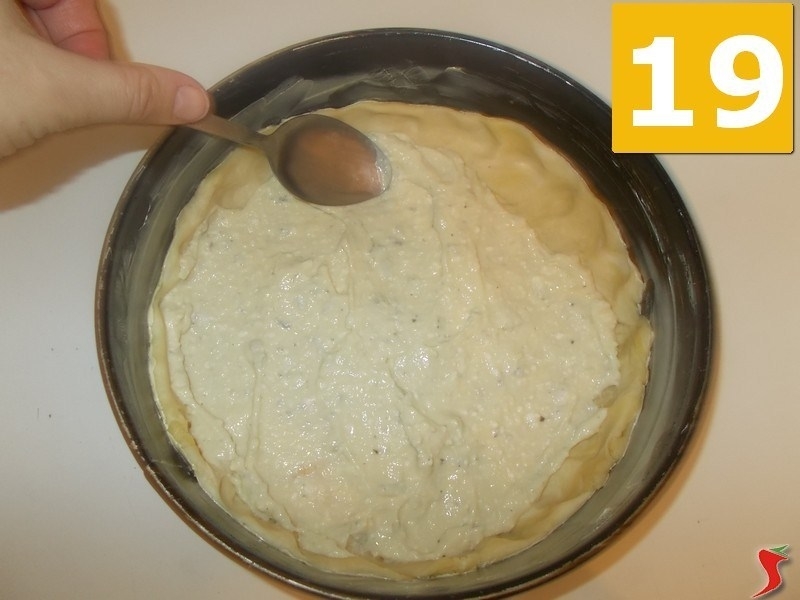 Ora nella ciotolina con i formaggi versate anche l'uovo sbattuto (16) e mescolate bene con una forchetta (17). Una volta ottenuta una crema omogenea riversatela sulla base della torta (18).
