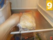 Una volta ottenuto l'impasto poggiatelo su un foglio di pellicola (7) che poi avvolgerete attorno (8) alla pasta. Quindi una volta “impacchettato” l'impasto riponetelo in frigo (9) per almeno due ore prima di utilizzarlo. Una volta pronto potrete schiacciarlo e allargarlo direttamente nella tortiera oppure lavorarlo prima, con il mattarello, per ottenere un disco di pasta per sfruttarlo nelle torte salate.