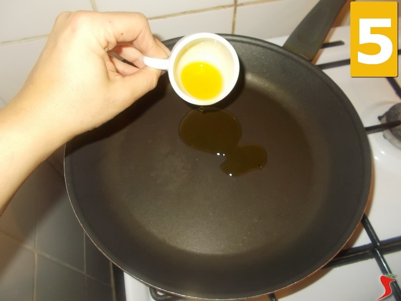 Quindi ora sbucciate la cipolla e tritatela (4) finemente sul tagliere. Versate cinque cucchiai di olio extravergine di oliva (5) in una padella ampia ed antiaderente per farlo scaldare ed una volta pronto unitevi la cipolla (6) a rosolare a fuoco moderato finché non diviene trasparente.