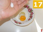 Ora aprite l'uovo in una ciotolina, aggiungetevi il latte (16) e salate (17) a vostro piacere. Quindi sbattete il tutto con una forchetta o in un cucchiaio (18) per amalgamare il tutto.
