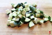 Lavare per bene tutte le verdure sotto l’acqua corrente e tagliare a cubetti le melanzane e le zucchine.