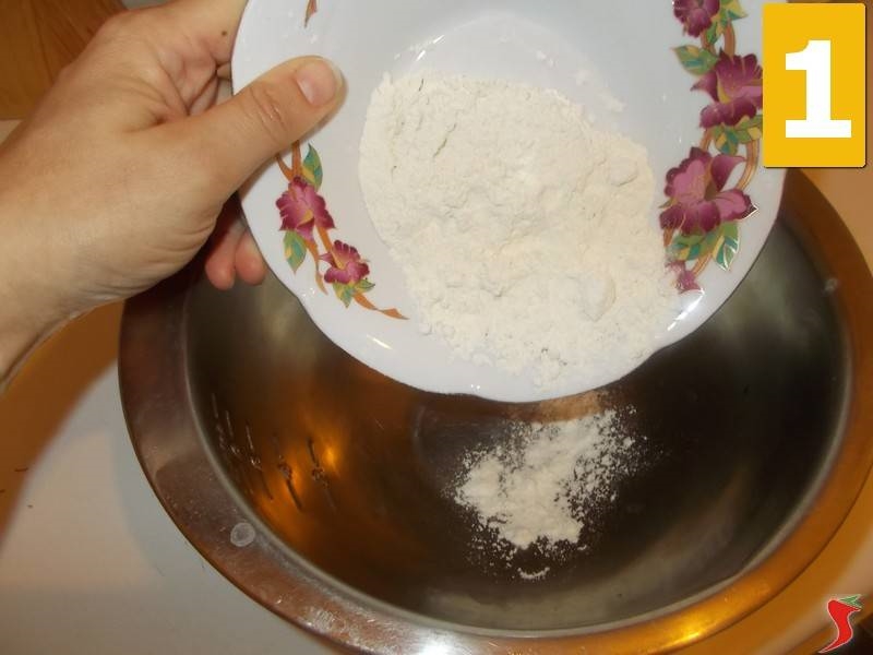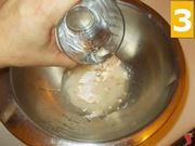Cominciate questa semplice ricetta dall'unione degli ingredienti per preparare l'impasto. Prendete quindi una planetaria metallica capiente e metteteci dentro la farina (1). Quindi alla farina unite anche l'olio di semi di girasole (2) e poi subito anche l'acqua (3).