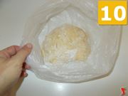 Trasferite l'impasto appena realizzato in una busta di plastica per alimenti (10) ed avvolgetela intorno ad essa fino a coprirla interamente (11). Procedete mettendo il composto in frigorifero per circa trenta minuti, nel secondo ripiano del frigorifero (12).