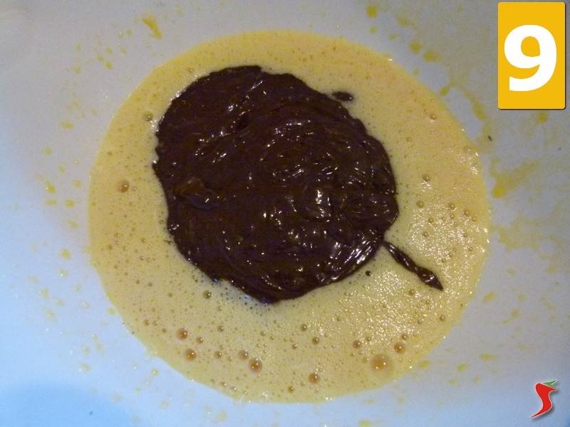 In seguito, aggiungere al composto la cioccolata fondente sciolta (9) e anche la miscela di farina, cacao zuccherato e lievito setacciati (10). Mescolare il tutto fin quando tutti gli ingredienti non si saranno amalgamati perfettamente (11).