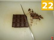 Prendete la barretta di cioccolato ed iniziate a tagliarla finemente con un coltello dalla lama lunga (22), una fino ad ottenere delle scaglie sottili (23), poi mette da parte dentro un piatto fondo (24).