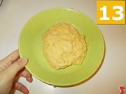 Dopo aver formato una palla con l'impasto (13), avvolgete il composto con della pellicola da cucina (14), ed mettete i frigorifero per circa trenta minuti (15).