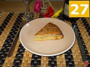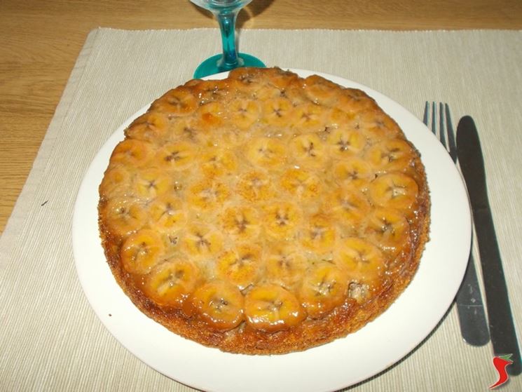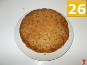 Ora infornate (25) in forno preriscaldato a 180°C per circa 50 minuti. Non aprite il forno, per non rovinare la levitazione del dolce. Una volta pronta, bucate con uno stuzzicadenti, che dovrà uscire dalla torta pulito, per indicare la cottura perfetta. Sfornate e fate freddare. Quindi aprite la cerniera della tortiera, e impiattate la torta (26) capovolgendola. La parte con le banane dovrà infatti andare in alto. Tagliate delle fette e portate in tavola (27) dopo il pasto.