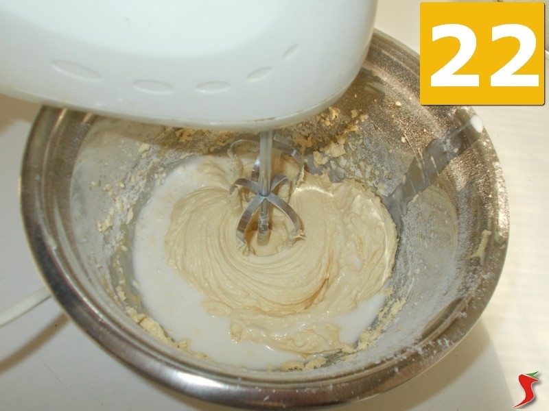 Mescolate di nuovo con la frusta elettrica (19), e quindi aggiungete il lievi per dolci (20) e poi versate anche il latte (21) intero.