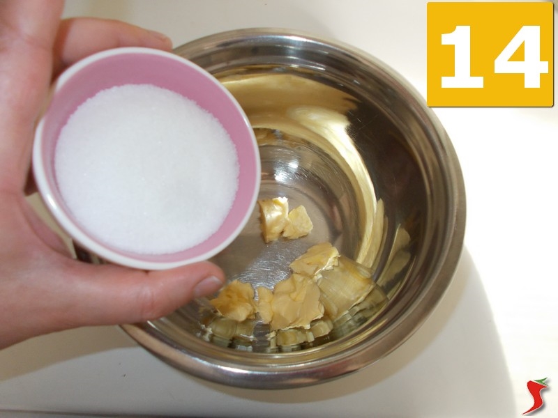Prendete un'altra planetaria e metteteci il burro avanzato (13), su cui verserete lo zucchero bianco (14). Con la frusta elettrica, mescolate bene (15) i due ingredienti.