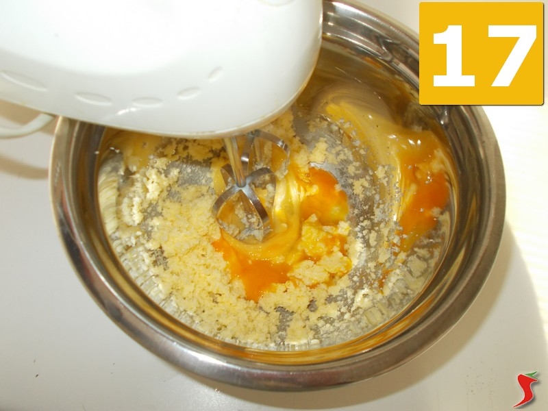 Quindi rompete l'uovo in una ciotolina, controllate che non vi siano schegge di guscio, e mettetelo nella planetaria (16) con il resto degli ingredienti. Mescolate bene di nuovo con la frusta elettrica (17), e poi setacciate la farina (18) nella planetaria.