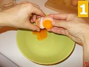 La prima cosa da fare per realizzare questo dolce, è rompere le uova separando i tuorli in un piatto fondo da portata (1), dopo aggiungete mano amano lo zucchero bianco (2) e con una forchetta sbattete in maniera energica (3), fino ad ottenere una crema liscia senza grumi. Una volta terminato questo passaggio, lasciate da parte il composto nello stesso piatto.