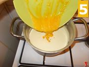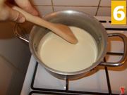 Ora prendete una pentola di medie dimensioni e versate al suo interno la panna liquida (4) e con un mestolo mescolate accuratamente fino al raggiungimento dell'ebollizione. Una volta che la panna inizia ad alzarsi nella pentola, unitevi la crema di uova e zucchero che avete realizzato in precedenza (5) e continuate la cottura a fiamma bassa, mescolando ancora accuratamente con un mestolo di legno, fino a quando non otterrete una crema liscia e densa (6). Completata anche questa operazione, versate il contenuto per la realizzazione della creme brulée in un piatto fondo e lasciatelo da parte.