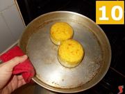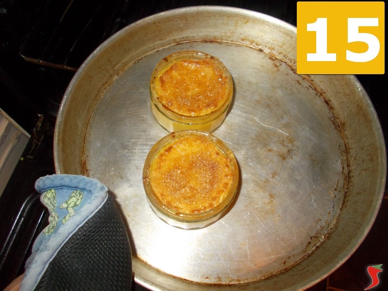 Ora ponete nuovamente le coppette nella teglia che avete utilizzato in precedenza sempre con un po di acqua all'interno (13) e mettete a cuocere ancora per qualche minuto in forno (14) ma stavolta con il grill, per far caramellare lo zucchero di canna. Una volta che la parte superiore della creme bruleé si sarà dorata a sufficienza, togliete dal forno (15) e lasciate raffreddare per qualche minuto prima di servirla in tavola. Servite sulle vostre tavole come dolce di fino pasto, accompagnandolo con del buon vino da dessert come il Jurançon francese nel caso qualcuno volesse servirsene.