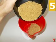 Ora mettete a sciogliere il burro in un pentolino (4) a fiamma moderata, dopo versate i biscotti triturati dentro un contenitore alto (5) e lo zucchero (6).