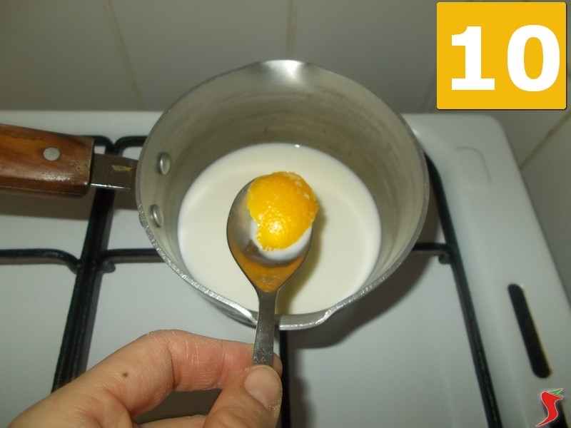 Poi versate il latte (4) in un pentolino per farlo scaldare a fuoco basso. Quindi lavate il limone e tagliate un pezzetto di scorza (5) che metterete nel latte (6) fino a quando sarà ben caldo.