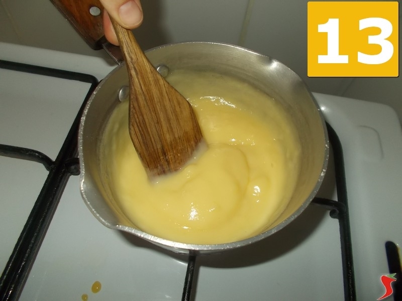 Quando il latte è ben caldo togliete la scorzetta di limone (10) con l'aiuto di un cucchiaio e quindi versateci dentro il composto di uova, zucchero e farina (11). Quindi mescolate bene (12) con il cucchiaio di legno ma lentamente, per far addensare la crema.