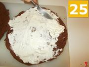Quando l'impasto al cacao ha finito di cuocere, sfornatelo (22) e fatelo raffreddare. Una volta freddo tagliatelo lungo lo spessore (23) per ottenere due dischi (24).