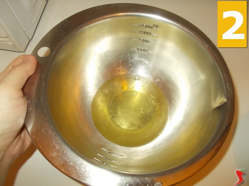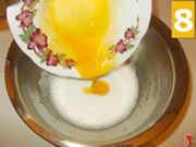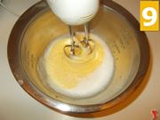 Poi sbattete i tuorli (7) con una forchetta e una volta ben sbattuto, versatelo negli albumi (8) sbattuti a neve, e quindi sbattete il tutto con la frusta elettrica (9) fino a mescolare bene gli ingredienti.