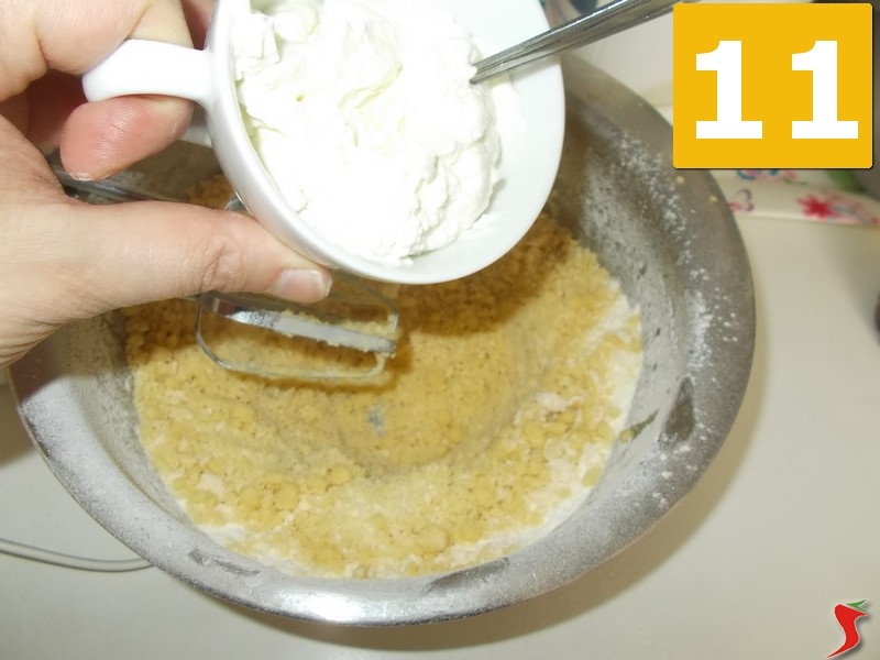 Mescolando inizierete ad amalgamare l'olio (10) e una volta ottenuto un composto omogeneo unite anche lo yogurt (11) e continuate ad amalgamare fino ad ottenere una crema densa (12) uniforme.