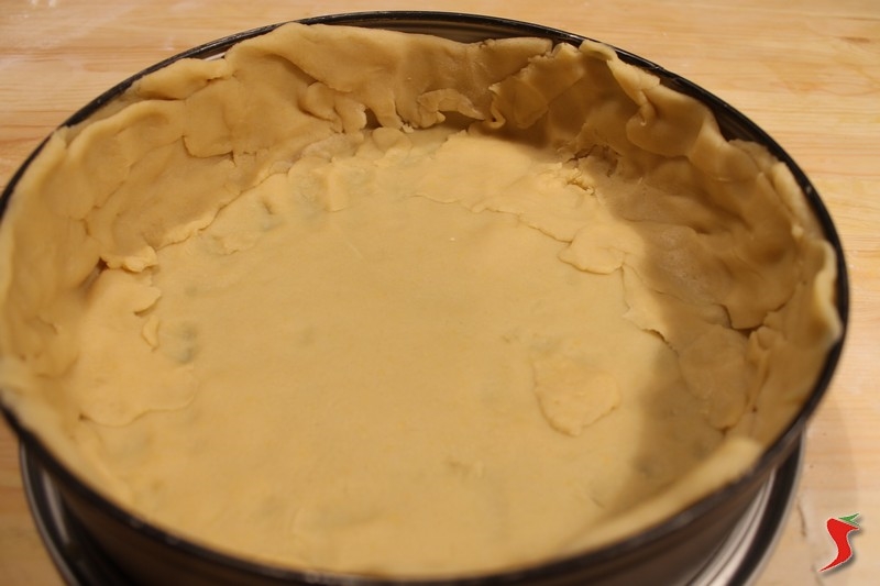 Ora prendete la pasta dal frigorifero e iniziate a tirarla per poi foderare una tortiera a cerniera avendo cura di foderare per bene anche i bordi. Fatto questo versate il ripieno ed infornate. La torta dovrà cuocere per 60 minuti a 180-200 °c.