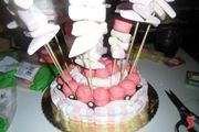 Per abbellire ancora di più la vostra torta con le caramelle rimaste infilzate dei bastoncini per spiedini e posizionate i vostri spiedini di marshmallow sulla torta.