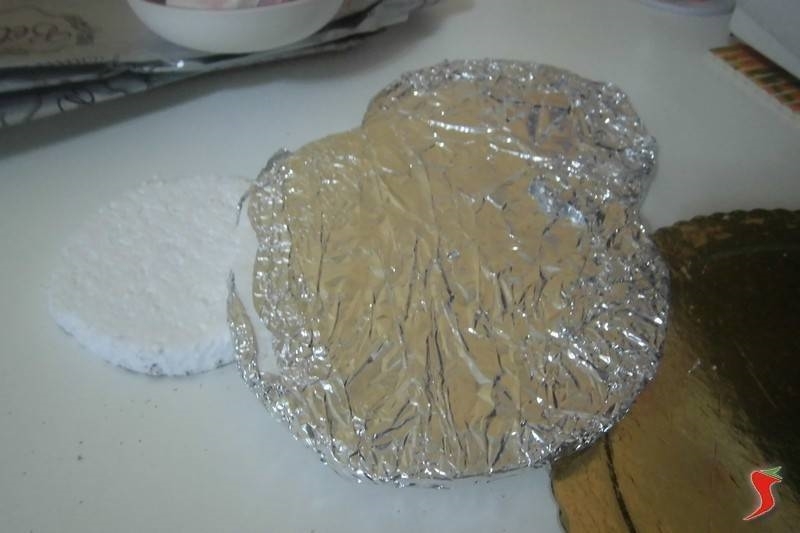 Per prima cosa dovrete assemblare la base. Preparate delle forme di polistirolo della forma che vi interessa per la vostra torta. Noi abbiamo usato tre cerchi di dimensioni diverse. Coprite il polistirolo con della carta stagnola e poi posizionate le basi l'una sull'altra. Per tenerle ferme infilzate un paio di stuzzicadenti in cima e fateli scendere fino alla base che poggia a terra. Tagliate la parte dello stuzzicadenti in eccesso. Preparate a questo punto tutti i marshmallow e le caramelle di modo da rendervi conto con quali forme di caramelle lavorare.