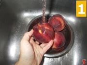 Ponete le pesche dentro uno scolapasta e lavatele accuratamente sotto abbondante acqua corrente (1), dopo mettetele su un tagliere pulito e dividetela a metà con un coltello dalla lama seghettata aiutandovi se occorre con le mani (2). Terminata questa operazione, sempre con il coltello, estraete il nocciolo interno (3).