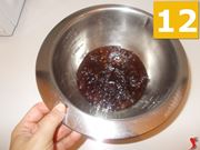 Trascorso il tempo di cottura, mescolate nuovamente con un mestolo di legno (10) e trasferite la marmellata di pesche dalla pentola in una planetaria o terrina (11) lasciando raffreddare per circa un'ora. Mette da parte la marmellata nello stesso contenitore (12).