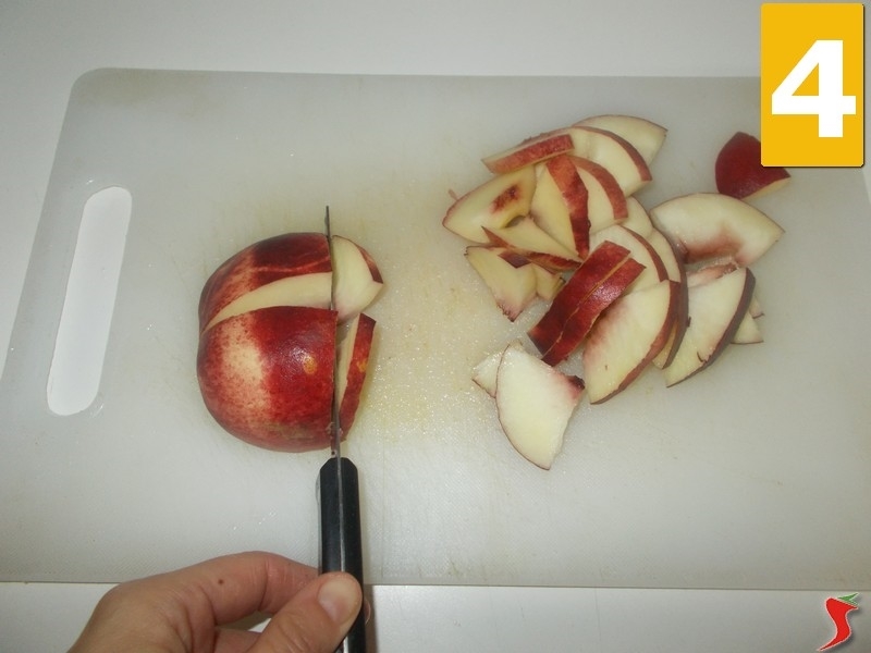 Ora dividete le due parti in quattro, ed affettate non troppo grossolanamente le pesche (4), dopo ponete su un piatto piano da portata (5) ed infine dentro una pentola di grandi dimensioni (6).
