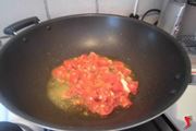 Tagliate finemente una cipolla e aggiungetela in padella dopo aver ritirato l'aglio. Aggiungete i vostri dadini di pomodorini e un mezzo bicchiere di acqua. Lasciate cuocere i pomodori affinchč si ammorbidiscano. Lavate le melanzane, scolatele e asciugatele un po' avvolgendole in uno straccio asciugapiatti. Non usate della carta poichč c'č il rischio che vi rimanga attaccata. Aggiungete le melanzane lavate ed asciugate al vostro pomodoro.