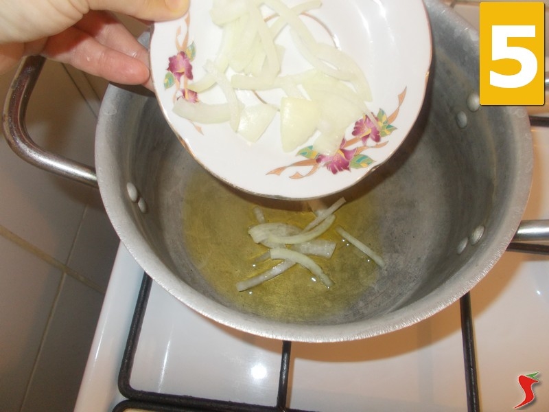 Ora prendete una pentola grande e versateci dentro cinque cucchiai di olio extravergine di oliva (4) da far scaldare a fuoco medio. Una volta caldo, aggiungete la cipolla tritata (5) e fatela soffriggere finché non diventa trasparente. Quando la cipolla ha soffritto, aggiungete la carne macinata (6), e iniziate a farla soffriggere.