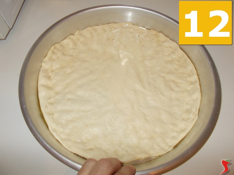 Prendete una teglia rotonda di grandi dimensioni ed aggiungete sul fondo un cucchiaio di olio di oliva extravergine (10), dopo ponetevi all'interno l'impasto lievitato ed iniziate a stenderlo con il palmo delle mani (11), fino a quando non si sarà coperto completamente il fondo (12).