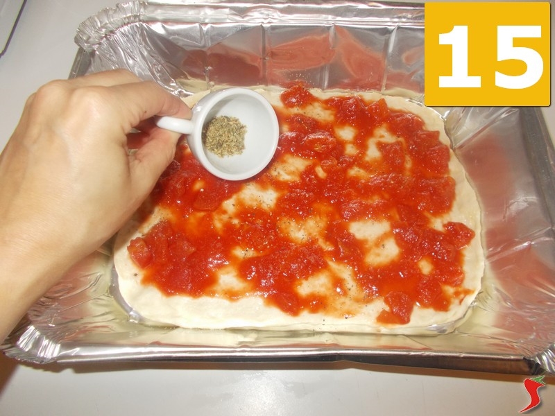 Dopo aver distribuito il pomodoro in maniera omogenea utilizzando un cucchiaio, aggiustate di sale fino a vostro gradimento (13) e proseguite con il pepe nero macinato fresco (14). Adesso per dare un più sapore alla vostra pizza, aggiungetevi un po di origano secco (15). Mettete a cuocere in forno preriscaldato a 150 gradi per circa trenta minuti, ed una volta ben cotta, sfornatela e servitela in tavola calda, accompagnandola con dell buona birra fresca oppure con del vino bianco dai sapori fruttati.