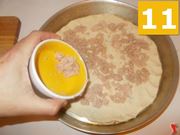 Prendete una parte di impasto e ponetela sul fondo di una teglia circolare unta con olio extra vergine di oliva in precedenza (10), una volta stesa completamente in modo omogeneo, aggiungete sopra il tonno al naturale (11) e un cucchiaio abbondante di olio extra vergine di oliva (12).