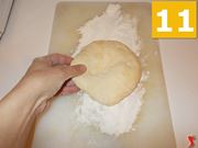 Adesso prendete un tagliere ed aggiungetevi sopra la base un po di farina (10), dopo ponete al centro l'impasto lievitato a vostro gradimento (11) e con un mattarello iniziate a stenderlo in senso verticale (12).