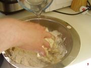 Ora disponete in una planetaria la farina, formandovi un buco al centro e iniziate a versare per primo il lievito disciolto in acqua e zucchero. Poi ponete l'acqua in cui è disciolto il sale e l'olio e quindi iniziate ad amalgamare mentre verserete lentamente a filo la restante acqua nell'impasto, continuando ad amalgamarlo e lavorarlo. Una volta ottenuta un impasto abbastanza consistente ponetelo su una spianatoia cosparsa di farina per lavorarlo meglio. Dovrete lavorarlo per circa 15 minuti fino ad avere una massa uniforme ed elastica. Quindi ponetela in un luogo non ventilato e asciutto a temperature tiepide e lasciatelo lievitare per almeno due ore, anche se si suggerisce di attendere fino a 4 ore. L'impasto dovrà raddoppiare di massa.