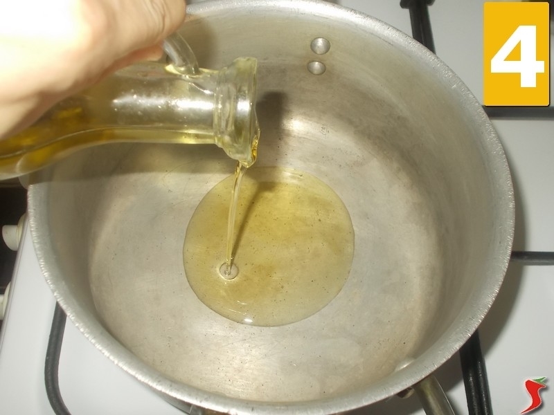 Poi prendete una pentola molto grande e versateci dentro cinque cucchiai di olio extravergine di oliva (4). Accendete il fuoco ponendo la fiamma a metà. Una volta riscaldato l'olio mettete nella pentola la carota intera (5), insieme alla cipolla e al sedano (6), sempre interi. Quindi lasciate soffriggere gli ortaggi per circa due minuti.