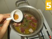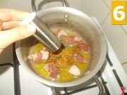 Aggiungete mano a mano la mente secca (4), poi il peperoncino macinato (5) e aggiustate con il sale fino (6) mescolando bene con un mestolo di legno e lasciate cuocere per quindici minuti a fiamma moderata.