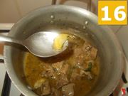 Ora con un cucchiaio togliete l'aglio intero dalla pentola (16), poi aggiungetevi il cous cous (17) e mescolate bene con un mestolo di legno (18), fin quando la carne ed il cous cous si saranno uniti completamente. Impiattate e servite in tavola ben caldo, accompagnato per chi lo gradisce, da un buon vino bianco poco aromatico.