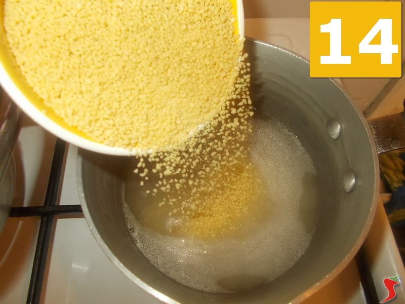 Aggiustate di sale a vostro gradimento l'acqua di cottura del cous cous (13) poi versatevi il cous cous (14) e mescolate bene fino a quando non si sarà asciugata tutta l'acqua (15).